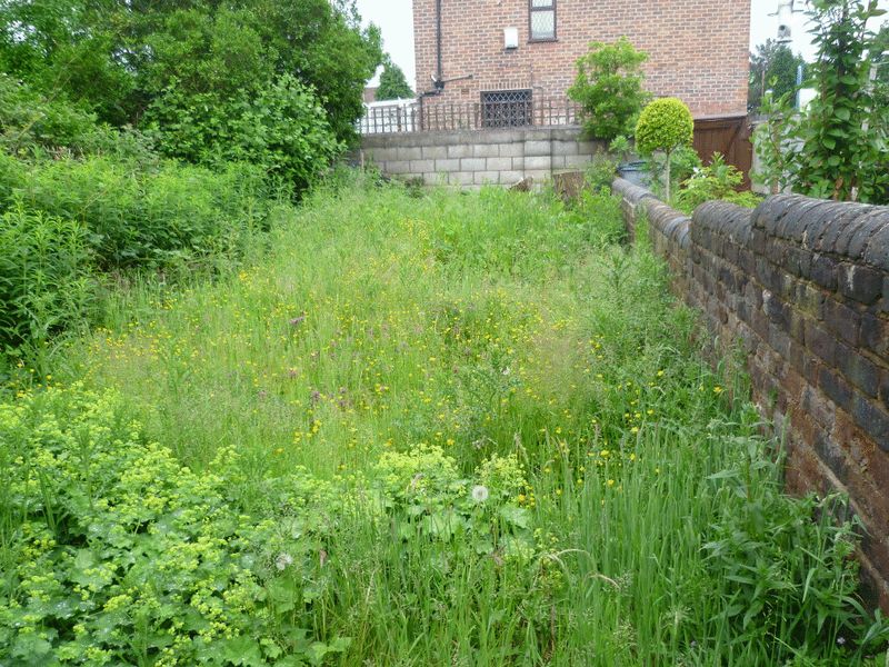 Small garden with low wall to the front. Rear garden with patio, lawn and shrubs.