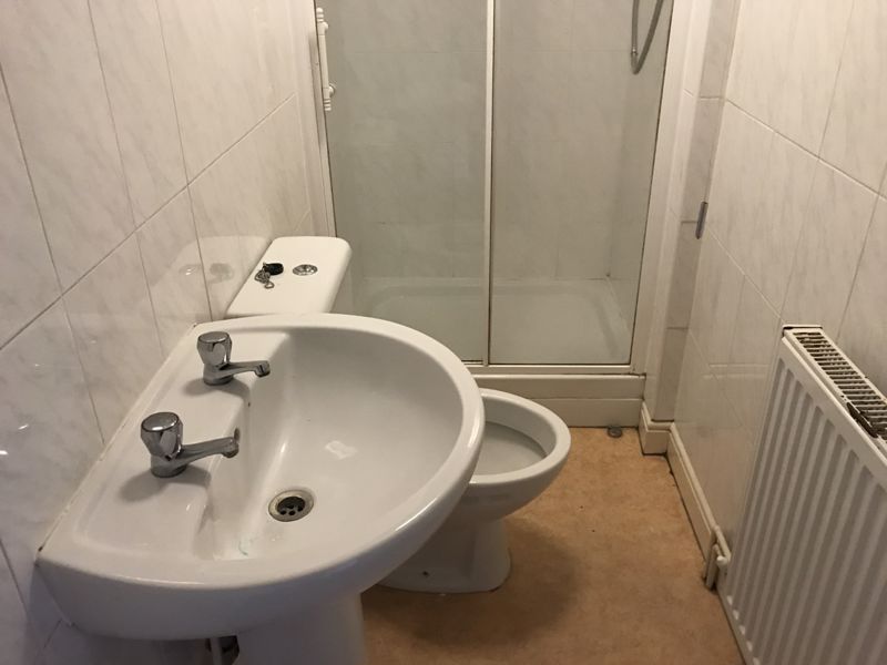 Modern fitted bathroom suite in white with pedestal basin, WC and enclosed shower cubicle with electric shower. Fully tiled walls and Vinyl floor. Includes radiator and extractor fan.