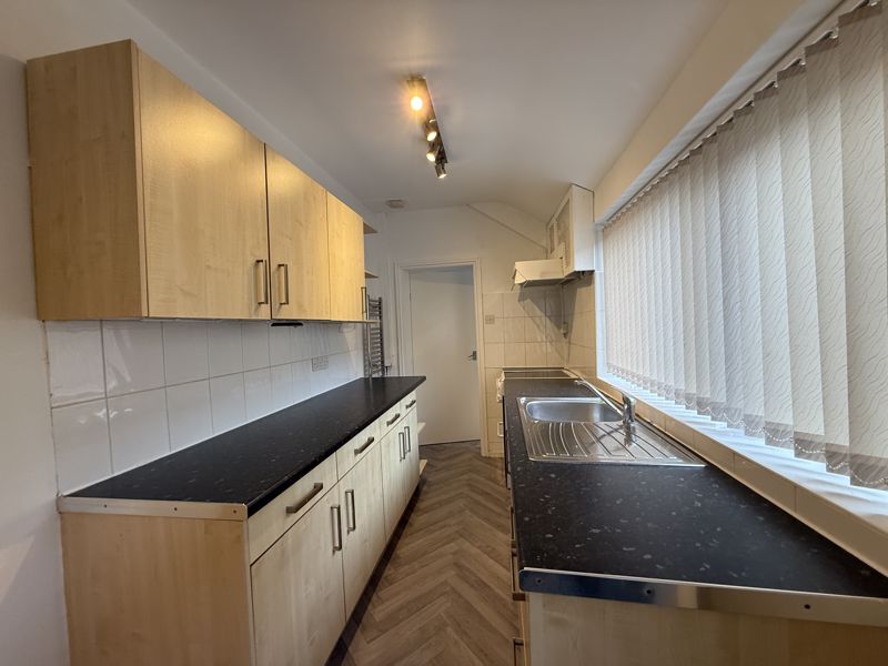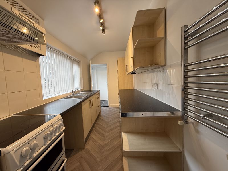 Modern fitted kitchen with pale wood wall and base units granite effect surfaces over. Part tiled walls and wood effect floor. Includes Cooker hob and extractor hood, Power Point, washer point, radiator.