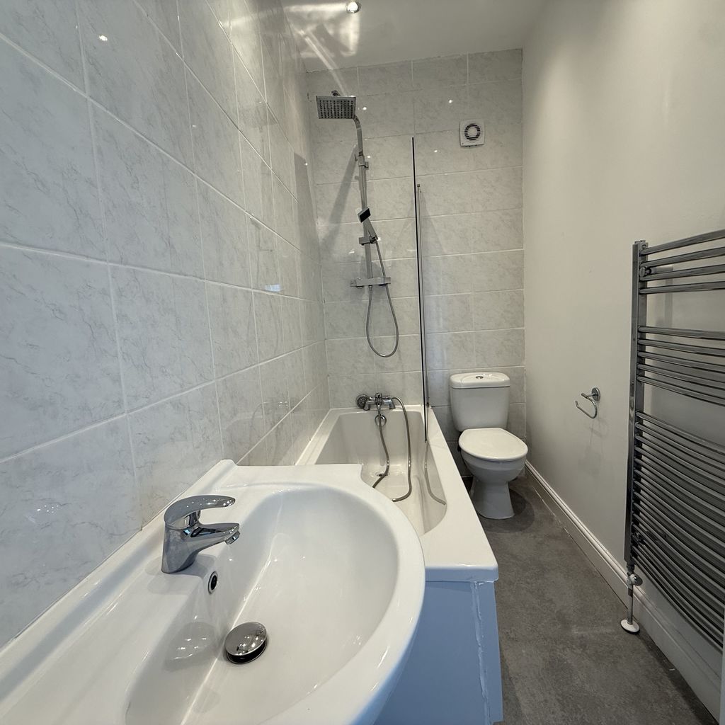 Modern fitted bathroom suite in white with WC, basin set in vanity unit, panel bath with rainfall style shower and screen over. Part tiled walls and vinyl floor. Includes inset spotlights, heated towel radiator and extractor fan.