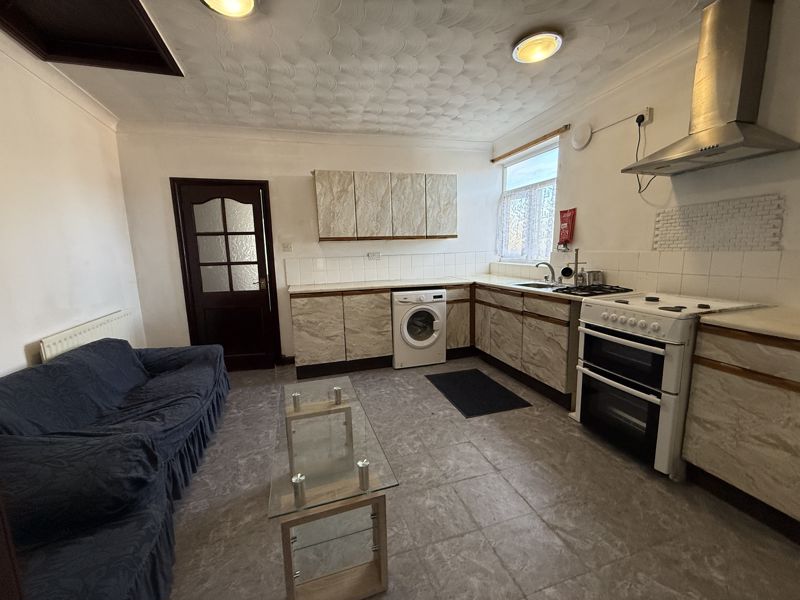 With beige wall and base units and marble effect work surfaces, incorporating a sink and drainer units, cooker, washing machine. Includes pvcu double glazed window to front aspect, power points, radiator, combi boiler, part tiled walls and tile effect vinyl flooring.
