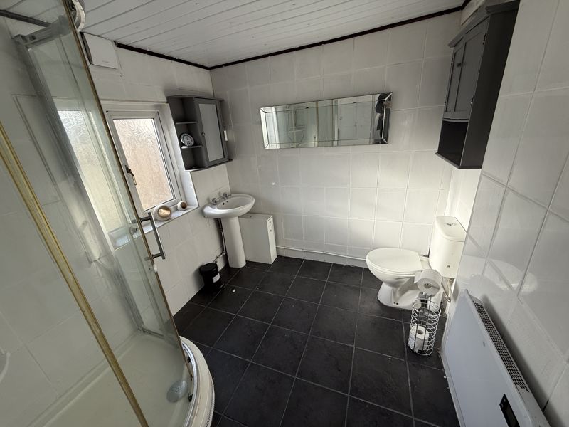 White bathroom suite comprising pedestal wash basin, WC, and shower cubicle. Includes towel radiator, part tiled walls and wood laminate flooring. Window: Pvcu Window orientation: Side Floor covering: Tiled Wall covering: Tiled Suite colour: White Included: Extractor, Towel radiator