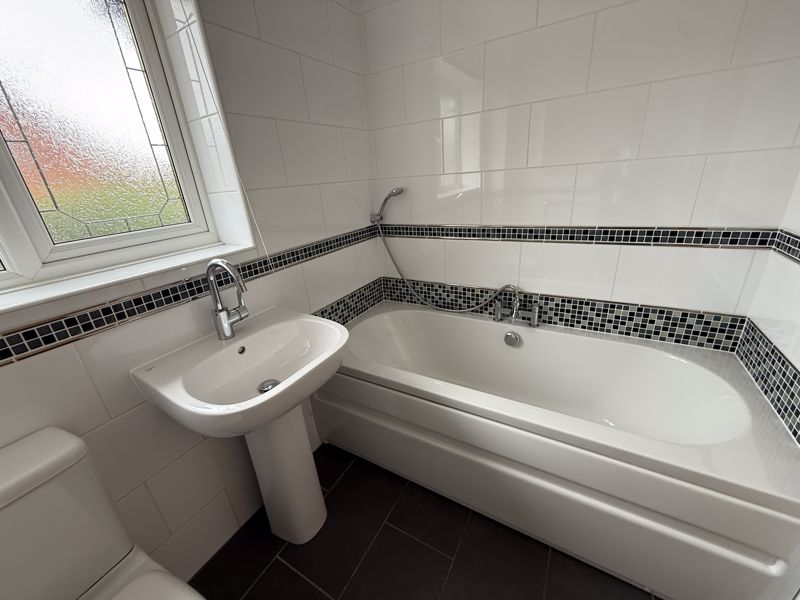 Modern fitted bathroom suite and white with WC, pedestal basin, panel bath with mixer shower over. Fully tiled walls and fully tiled floor. Includes heated chrome towel radiator.