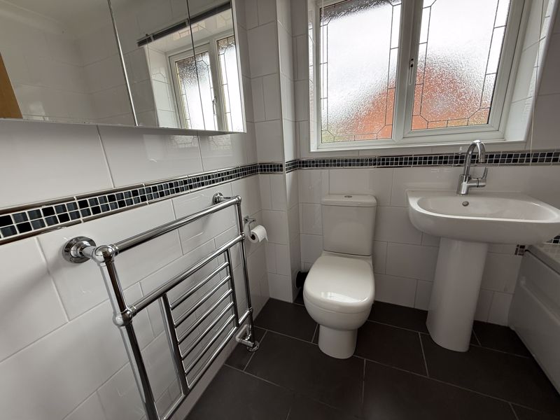 Fitted bathroom suite in white with WC, pedestal basin, enclosed shower cubicle with combination shower. Fully walls and tiled floor. Includes heated chrome towel radiator.