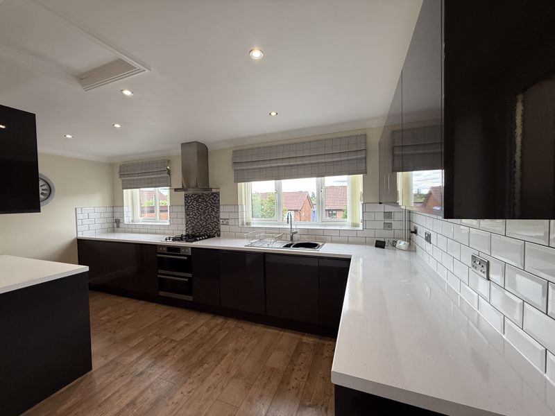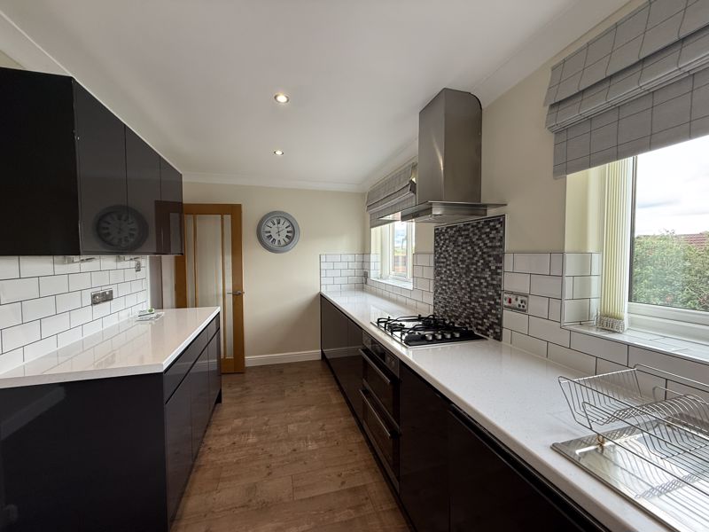 Modern fitted kitchen with grey wall and base units marble effect surfaces over. Part tiled walls and wood effect floor. Includes cooker point, Power Point, radiator, door to rear and garage.