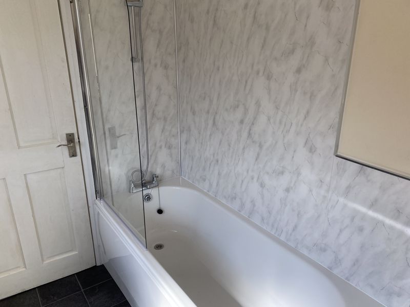Modern fitted bathroom suite in white with WC, pedestal basin, panelled bath with mixer shower and screen over, part plasticised walls and tile effect floor. Includes radiator, inset spotlights and extractor fan.