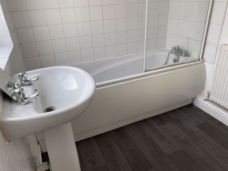 With white suite comprising WC, pedestal washbasin and panelled bath with mixer shower over and shower screen. Includes single glazed window to side aspect, radiator, par-tiled walls and tiled flooring.