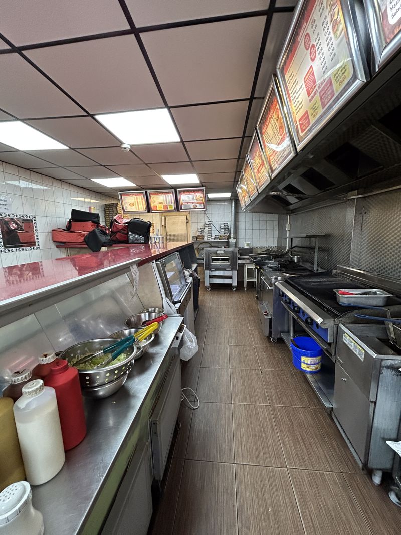 With sales counter, fitted display unit, metal cooker, grill and fryer, suspended ceiling with inset lighting, and tiled flooring.