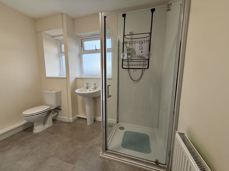 Modern fitted bathroom suite in white with WC, pedestal basin, panel bath, enclosed shower cubicle with electric shower. Part marble effect walls and tile effect floor. Includes radiator and extractor fan.