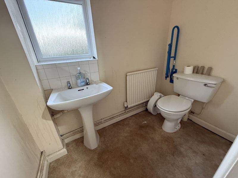 Fitted suite in white with pedestal basin and WC. Part tiled walls and vinyl floor. Includes radiator.