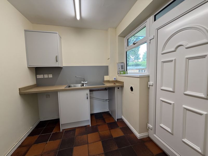 Modern fitted wall and base units in pale grey with wood effect surface and sink over. Tiled floor. Includes Washer point, Power Point, door to rear.