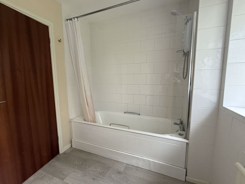 Fitted suite in white with pedestal basin, panel bath with electric shower over. Part tiled walls and wood effect floor. Includes radiator.