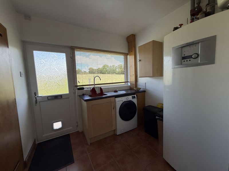 Fitted wall and base units in pale wood with granite effect surface. Part tiled walls and tiled floor. Includes Washer point, Power Point, ground source heat pump, , door to rear and built-in cupboards.