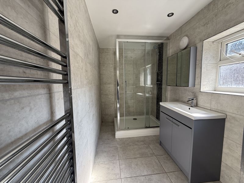 Modern fitted bathroom suite in white comprising WC, basin set in vanity unit and enclosed cubicle shower . Includes pvcu double glazed window to side aspect, radiator, extractor fan, tiled walls and tiled flooring.