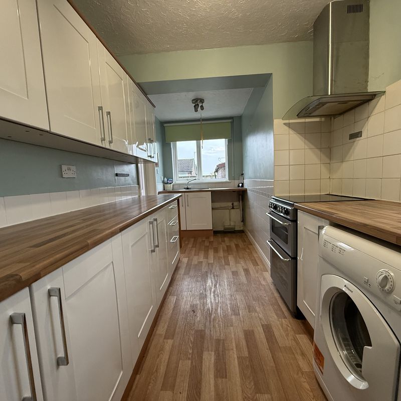 Modern fitted kitchen with white wall and base units wood effect surfaces over. Part tiled walls and wood effect floor. Includes cooker point, Power Point, extractor hood, Washer point.