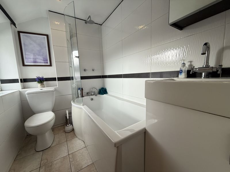 Modern fitted bathroom suite in white with WC, basin set in vanity unit, panel bath with rainfall style shower and screen over. Major majority tiled walls and fully tiled floor. Includes heated chrome towel radiator, extractor fan.