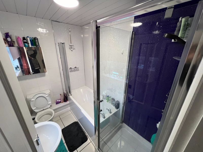 Modern fitted bathroom suite in white with WC, pedestal basin, panel bath with combination shower and screen over. Separate shower cubicle with electric shower. Part tiled walls and part marble effect walls. Extractor fan and radiator.