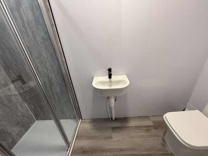 Fitted bathroom suite in white with basin, WC, enclosed shower cubicle with electric shower and screen. Part plasticised walls and wood effect floor. Includes extractor fan.