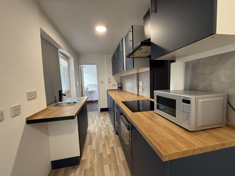 Modern fitted kitchen with blue wall and base units wood effect surfaces over. Wood effect floor. Includes integrated cooker hob and extractor hood, Power Point, electric heater, water heater, door to rear.