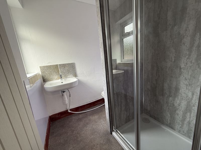 Fitted bathroom suite and white with WC, pedestal basin, enclosed shower cubicle with electric shower and screen. Part tiled walls and vinyl floor. Includes extractor fan.