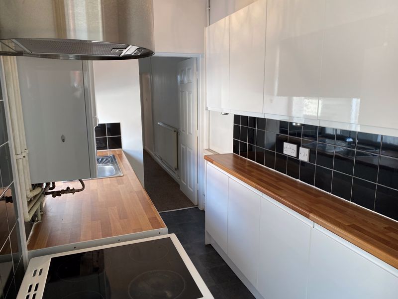 Fitted kitchen with cream units, wood-effect worktops, and sink and drainer unit. Also with pvcu double glazed window to side aspect, extractor hood, radiator, power points, cooker point, washer point, part-tiled walls, and vinyl flooring.