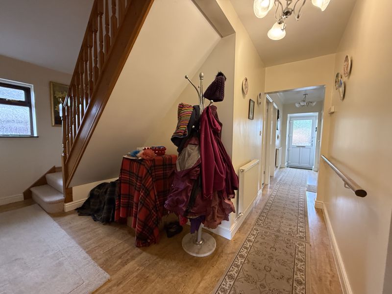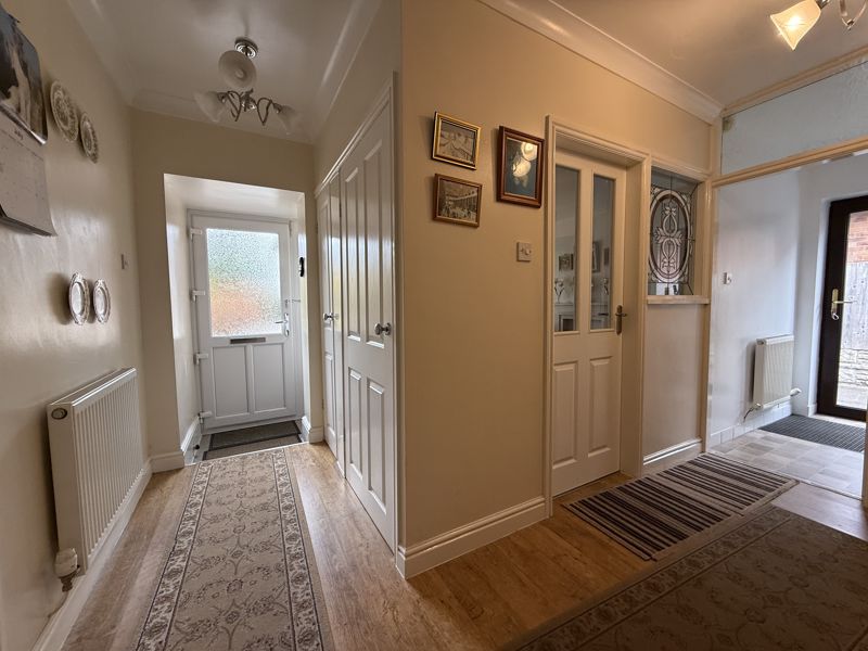 To the frontage is a low maintenance garden and paved driveway suitable for parking three cars leading to a side drive onto a double garage. At the rear are extensive lawns and a patio seating area.
