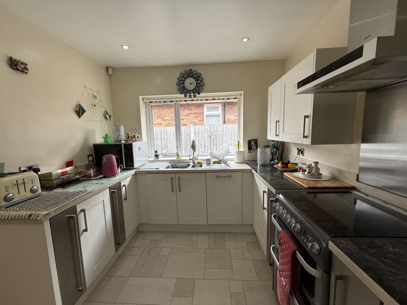 Modern fitted kitchen with white wall and base units marble effect surfaces over. Fully tiled floor. Includes double sink, Power Point, cooker point, radiator.