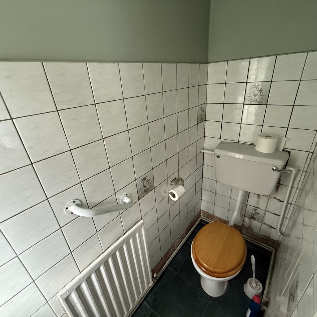 WC in white. Part tiled walls and tile floor. Includes radiator and extractor fan.