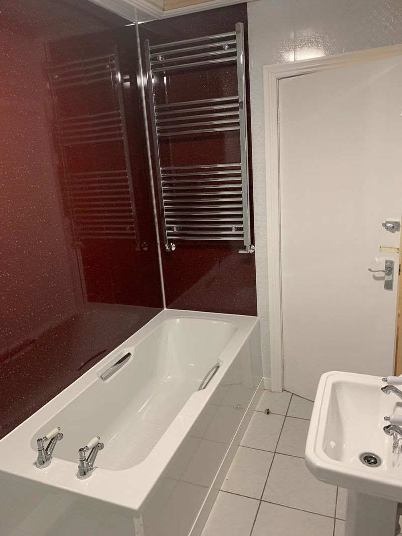 Modern fitted bathroom suite in white with WC, pedestal basin, panel bath, enclosed shower with electric shower. Fully plastercised walls and ceiling. Tiled floor. Includes radiator, extractor fan.