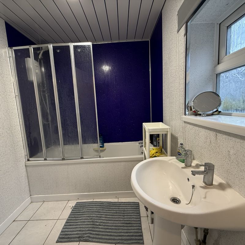 Modern fitted bathroom suite in white with WC, pedestal basin, panel bath with electric shower and screen over. Fully plastercised walls and ceiling, tiled floor. Includes radiator and extractor fan.